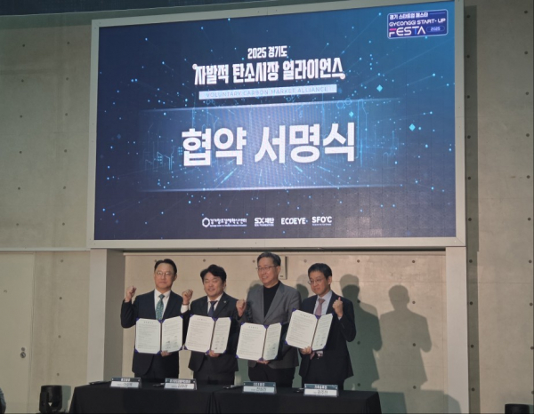 경기창조경제혁신센터(이하 경기혁신센터), SDX재단, ㈜에코아이, 사단법인 기후솔루션(SFOC)은 지난 27일 오전 10시 판교 제2테크노밸리 기업지원허브에서 ‘자발적 탄소시장(VCM) 얼라이언스’ 출범식 및 협약식을 개최하고 함께 ‘한국형 자발적 탄소시장 조성’을 위해 협력하기로 했다.
